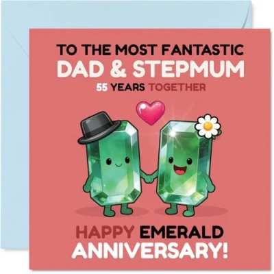 Full of playful affection. this design shows two adorable emerald gemstones holding hands. capturing the fun spirit of a 55th anniversary together The hand-drawn gem characters pop in vibrant green and pink, adding a quirky twist to a classic milestone card and making it stand out on the mantelpiece Printed on glossy single sided board with an uncoated inside for a smooth writing experience. No smudging when writing inside. Recyclable and responsibly sourced Inside message: Stepmum & Dad. Comes complete with a matching envelope, ready to send your love. The 145mm Square format is convenient to display or post Designed, printed and packed in the UK with care-crafted to help you mark their emerald anniversary in cheerful style. Printed in the UK. A thoughtful choice that helps you send smiles and warm wishes