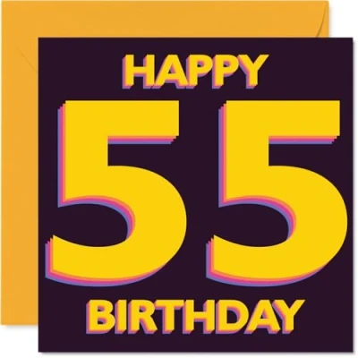 Full of festive spirit, this card's bold 'HAPPY 55 BIRTHDAY' design shines against a deep background. instantly setting a joyful tone for their special day Standout yellow and purple numbers bring a bright, modern twist, making it a real eye-catcher amongst the birthday cards on the mantelpiece. Recyclable; printed in UK for a considerate choice Printed on quality gloss single sided board with an uncoated matte inside for easy writing. No smudging when writing inside, so your message stays crisp Blank inside gives you plenty of space to add your own personal wishes. Comes with an envelope, so it's ready to pop in the post or hand-deliver Proudly made in the UK with recyclable, FSC-certified - a card that looks good and does good. We're here to help you celebrate in style. Ideal for a mum or dad celebrating a milestone birthday