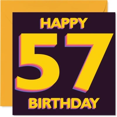 Brings a burst of birthday spirit with its striking yellow '57' centre stage - perfect for marking a memorable milestone in style. Birthday card with a light-hearted design style Eye-catching design features vibrant yellow text on a rich purple background, ensuring this card stands out from the crowd. Recyclable; printed in UK for a considerate choice Printed on premium gloss single sided board with an uncoated inside for easy writing. No smudging when writing inside. Printed on 360 micron stock for a confident, premium feel Blank inside, so you can pen your own personal message. Comes complete with an envelope for hassle-free gifting. The 145mm Square format is convenient to display or post Designed and printed in the UK using recyclable materials and FSC certified - quality that feels good and does good. Ideal for a mum or dad celebrating a milestone birthday