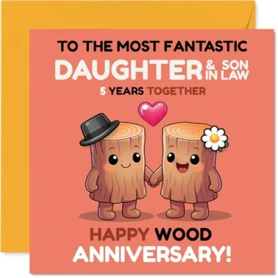 Playfully celebrates a wood anniversary with two cheerful wooden characters holding hands, capturing the fun and love of five years together Features a bright, charming design in pink, brown, and yellow, with a quirky 'HAPPY WOOD ANNIVERSARY!' message for an extra dash of personality Printed on glossy single-sided board with an uncoated inside for easy writing. No smudging when writing inside. Printed on 360 micron stock for a confident, premium feel Inside message: Daughter & Son In Law. Includes a quality envelope for a polished finish. The 145mm Square format is convenient to display or post Created in the UK with recyclable FSC-certified, you can feel good about your choice for this special milestone. Printed in the UK. A thoughtful choice that helps you send smiles and warm wishes