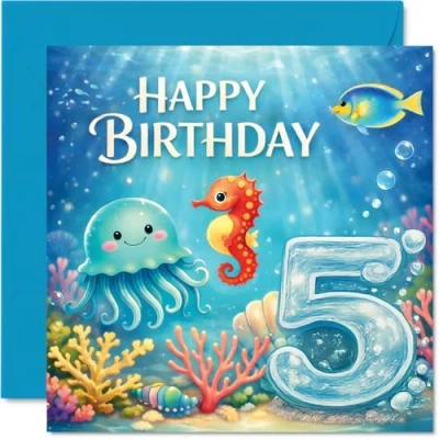Brings a wave of happiness with its joyful sea creatures and vibrant coral, guaranteed to make little ones beam on their special day. Birthday card with a light-hearted design style Features a playful underwater world in lively blue, pink, yellow, and orange, starring a cheeky jellyfish and a friendly seahorse. Recyclable and printed in UK for a considerate choice Printed on quality gloss single sided board with uncoated inside - No smudging when writing inside. Made using responsibly sourced FSC board Blank inside, so you can add your own personal birthday wishes. Comes with an envelope for easy gifting. The 145mm Square format is convenient to display or post Created and printed in the UK, fully recyclable, and thoughtfully designed for a memorable birthday surprise