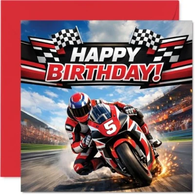 Playful 5th Birthday Card Rev Up the Fun Bold Motorcycle Racing Scene in Vivid Red and Black Perfect for Little Thrill seekers 145mm Square, Envelope Included
