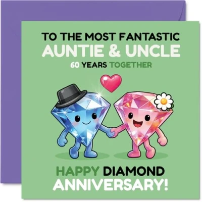 Playful and uplifting, this card captures the joy of a diamond anniversary with two adorable diamond characters beaming together. Anniversary card for Auntie & Uncle with a light-hearted design style Features a lively motif with sparkling diamonds, pops of green, pink, and blue, and a cheerful '60 years together' message. Recyclable and printed in UK for a considerate choice Printed on glossy, FSC-certified board with an uncoated inside for easy writing. No smudging when writing inside. Printed on 360 micron stock for a confident, premium feel Inside message: Auntie & Uncle. Complete with a quality envelope, making it a treat to open and display. The 145mm Square format is convenient to display or post Proudly made in the UK using recyclable materials-ideal for celebrating a milestone with a playful twist. Printed in the UK. A thoughtful choice that helps you send smiles and warm wishes