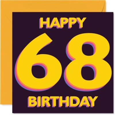 Full of birthday cheer, this card pops with bold yellow 'HAPPY 68 BIRTHDAY' text that's sure to raise a smile on a special day. Birthday card with a light-hearted design style Standout design with striking numbers in yellow against a deep purple backdrop, perfect for making their 68th feel extra memorable. Recyclable; printed in UK for a considerate choice Printed on quality gloss board with an uncoated inside-no smudging when writing inside-so your message stays crisp. Printed on 360 micron stock for a confident, premium feel Blank inside for your own words and comes complete with an envelope to make posting or gifting easy. The 145mm Square format is convenient to display or post Designed and made in the UK using recyclable materials and FSC-certified -celebrate with confidence and a clear conscience. Ideal for a mum or dad celebrating a milestone birthday