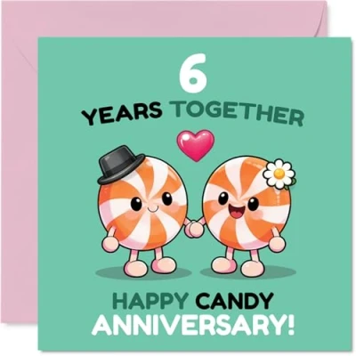 Playful 6th Anniversary Card Celebrate Six Sweet Years Peppermint Candy Characters in a Fun Scene 145mm Square, Envelope Included
