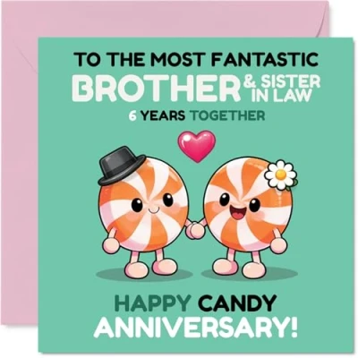 A playful way to mark six years together, featuring two joyful candy characters that instantly lift the mood and add a sprinkle of fun. Anniversary card for Brother & Sister In Law with a light-hearted design style Bright, lively colours and a cute, themed design make this card stand out for anyone who loves a bit of whimsy on their anniversary. Recyclable and printed in UK for a considerate choice Crafted on glossy single sided board with an uncoated inside - no smudging when writing inside, so your message stays neat and personal. Printed on 360 micron stock for a confident, premium feel Inside message: Brother & Sister In Law. Matching envelope included for a polished finishing touch. The 145mm Square format is convenient to display or post Thoughtfully designed and printed in the UK with recyclable materials and FSC - a quality choice that feels good to give. A thoughtful choice that helps you send smiles and warm wishes