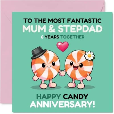 Playful 6th Anniversary Card for Stepdad & Mum Brighten Their Special Day Cheerful Cartoon Candy Couple Celebrating in Vivid Colours 145mm Square, Envelope Included