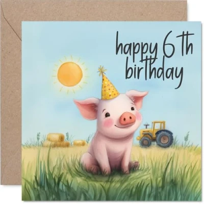 Brimming with playful energy, this card features a beaming pig in a party hat, ready to celebrate a 6th birthday in style. Birthday card with a light-hearted design style A sunny farm scene with pastel yellow and green hues sets a joyful backdrop, with the adorable pig stealing the show. Recyclable and printed in UK for a considerate choice Printed on glossy single-sided board and uncoated inside for easy writing. No smudging when writing inside. Printed on 360 micron stock for a confident, premium feel Blank inside, so you can craft your own personal message. Envelope included for a smart finish. The 145mm Square format is convenient to display or post Thoughtfully made in the UK with FSC-certified, recyclable -designed to make any youngster's birthday even brighter