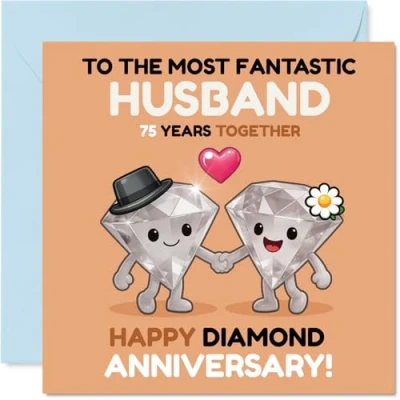 Playful 75th Anniversary Card for Husband Celebrating 75 Sparkling Years Adorable Diamond Duo Design with Pops of Pink and Orange 145mm Square, Envelope Included