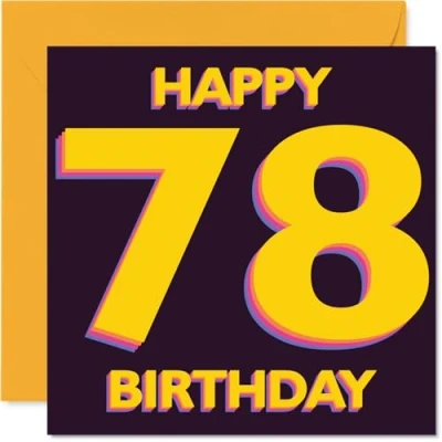 Packed with positive vibes, this bold card features a beaming 'HAPPY 78 BIRTHDAY' in bright yellow and purple. making it feel truly special for their big day Eye-catching motif with large numbers and festive typography stands out on any mantelpiece-perfect for making the occasion memorable. Recyclable; printed in UK for a considerate choice Printed on gloss single sided board with an uncoated inside for easy writing. No smudging when writing inside. Made in the UK using responsibly sourced FSC board Blank inside so you can add your own personal touch. Envelope included for effortless gifting. The 145mm Square format is convenient to display or post Printed on high quality recyclable card, you can send your best wishes with confidence-designed to bring a big smile to anyone celebrating 78