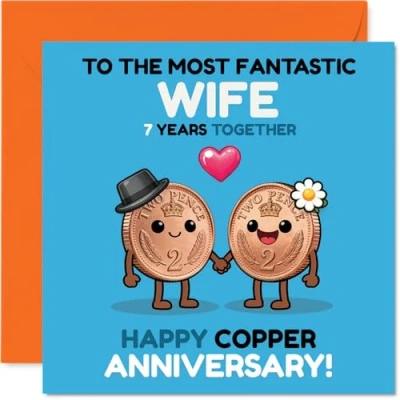 Playful and affectionate, this card features two adorable cartoon coins beaming with love - perfect for marking your seven-year milestone in a fun way The vibrant blue, orange and pink motif makes this design stand out, giving a quirky twist to the traditional copper anniversary theme. Recyclable and printed in UK for a considerate choice Printed on quality gloss single sided board with an uncoated inside. No smudging when writing inside - your personal message stays crisp and clear Inside message: Wife. Includes a matching envelope, so it's ready to give right away. The 145mm Square format is convenient to display or post Proudly made in the UK using FSC-certified, recyclable - a feel-good choice for a memorable anniversary. Printed in the UK. A thoughtful choice that helps you send smiles and warm wishes