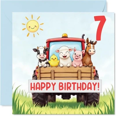 Playful 7th Birthday Card Chipper Fun Cartoon Animals Riding a Bright Red Tractor 145mm Square, Envelope Included