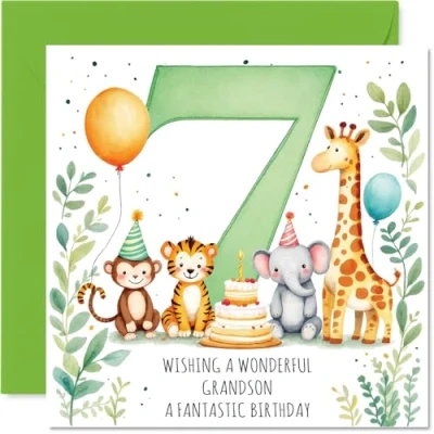 Playful 7th Birthday Card for Grandson Bursting with Cheer Party Animals, Cake and Balloons a Big Number 7 145mm Square, Envelope Included