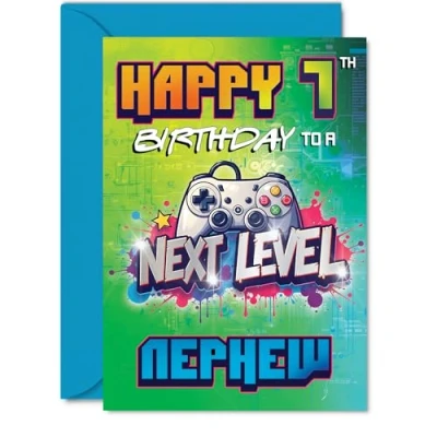 Packed with playful energy, this card's bold 'NEXT LEVEL NEPHEW' headline and colourful controller instantly set a celebratory tone for a 7th birthday Features a lively gaming theme in bright green, blue, red, and purple, making it a top pick for young gamers who love their consoles. Recyclable and printed in UK for a considerate choice Printed on quality gloss single sided board with an uncoated inside, ensuring no smudging when writing inside your special message. Printed on 360 micron stock for a confident, premium feel Inside message: Have An Epic Day. Supplied with an envelope for easy gifting and that 'extra life' touch. The 5x7 Inch format is convenient to display or post Designed and printed in the UK with recyclable materials and FSC-certified -so you can feel good about your choice. A thoughtful choice that helps you send smiles and warm wishes