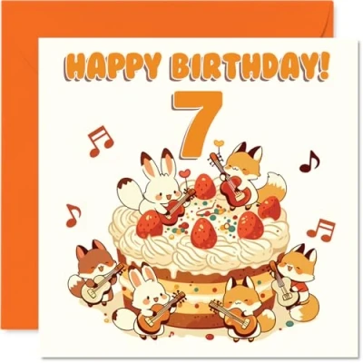 Joyful cartoon animals gathered round a big birthday cake set a playful, cheeky tone that's sure to spark a grin. Birthday card with a light-hearted design style Features adorable creatures in party hats, lively musical notes and a colourful cake - a whimsical design that stands out from the crowd. Recyclable and printed in UK for a considerate choice Printed on gloss single sided board with an uncoated inside, so no smudging when writing inside. Made with FSC certified board and fully recyclable Blank inside, giving you space to add your own message. Comes complete with an envelope for easy gifting. The 145mm Square format is convenient to display or post Designed and printed in the UK for quality you can trust - perfect for making their 7th birthday feel extra special
