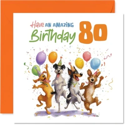 Full of birthday fun. this lively card features four excited dogs surrounded by colourful balloons and confetti. making anyone's 80th feel extra special Brightly illustrated with playful pups and a festive party scene. the design pops with orange. green. blue. yellow and purple for a truly eye-catching finish Printed on quality gloss single sided board with uncoated inside for your personal message. No smudging when writing inside. Made with FSC board, so you can feel good too Blank inside so you can add your own cheeky, heartfelt or silly wishes. Comes with its own envelope, ready to give. The 145mm Square format is convenient to display or post Designed and printed in the UK using recyclable materials, this card is made to bring a smile-while being kinder to the planet. Ideal for a mum or dad celebrating a milestone birthday