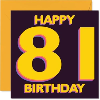 Lifts the mood with its cheerful 'HAPPY 81 BIRTHDAY' in bold yellow against a deep purple background-guaranteed to brighten their big day. Birthday card with a light-hearted design style A striking, modern design that stands out on the mantelpiece and makes this milestone birthday feel even more special. Recyclable; printed in UK for a considerate choice Printed in the UK on quality gloss board with an uncoated inside-no smudging when writing inside. Made with FSC-certified materials and fully recyclable Blank inside for your personal message and comes complete with an envelope-easy to send or hand-deliver. The 145mm Square format is convenient to display or post Designed to impress and made to last, it's a colourful way to mark 81 years-ideal for mums, dads, friends or colleagues. Ideal for a mum or dad celebrating a milestone birthday