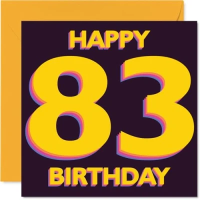 Celebrates a fabulous 83rd with bold, cheerful typography in yellow and purple - guaranteed to stand out and make them feel special. Birthday card with a light-hearted design style Modern design features crisp numbers and a striking dark background, perfect for those who appreciate a card that's both fun and stylish. Recyclable; printed in UK for a considerate choice Printed on quality gloss single sided board with an uncoated inside for easy writing. No smudging when writing inside. Printed on 360 micron stock for a confident, premium feel Blank inside, giving you plenty of space for your own personal birthday wishes. Matching envelope included for easy gifting. The 145mm Square format is convenient to display or post Proudly made in the UK using recyclable, FSC-certified - designed to make every milestone memorable while caring for the planet. Ideal for a mum or dad celebrating a milestone birthday