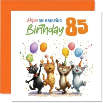 Playful 85th Birthday Card Bursting with Cheer Four Festive Cats, Balloons and Confetti Sure to Brighten Anyone's Big 145mm Square, Envelope Included