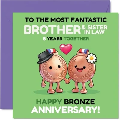 Marks the 8th anniversary with a playful vibe, featuring a cheerful pair of cartoon medals dressed up as a couple - sure to raise a grin. Anniversary card for Brother & Sister In Law with a light-hearted design style Eye-catching motif with vibrant green, pink, brown and purple hues, plus a cute heart detail, makes this card stand out from the usual. Recyclable and printed in UK for a considerate choice Crafted from gloss single sided board and uncoated inside for effortless writing. No smudging when writing inside. Fully recyclable and produced in the UK Inside message: Brother & Sister In Law. Arrives with a matching envelope to complete the thoughtful gesture. The 145mm Square format is convenient to display or post Printed on FSC-certified, giving you quality you can trust while being kinder to the environment. Printed in the UK. A thoughtful choice that helps you send smiles and warm wishes