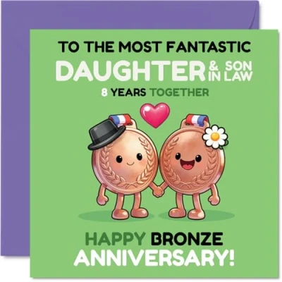 Playfully marks eight years together with cheerful cartoon medals holding hands, adding a light-hearted twist to the special milestone. Anniversary card for Daughter & Son In Law with a light-hearted design style Features a bright design with green and pink hearts and smiling medals, giving a sweet, unique take on the classic bronze anniversary card. Recyclable and printed in UK for a considerate choice Printed on quality gloss board with an uncoated inside for easy writing. No smudging when writing inside so your message stays neat and tidy Inside message: Daughter & Son In Law. Comes with an envelope, making it ready to gift straight away. The 145mm Square format is convenient to display or post Designed and printed in the UK using eco-friendly FSC-certified for a card you can feel good about giving. A thoughtful choice that helps you send smiles and warm wishes