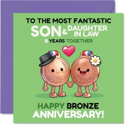 Full of playful charm, this card features adorable medal characters beaming with love, capturing the fun spirit of a bronze anniversary. Anniversary card for Son & Daughter In Law with a light-hearted design style The quirky cartoon medals and bright, cheerful colours give this card a stand-out look that's perfect for couples who love a bit of fun. Recyclable and printed in UK for a considerate choice Printed on quality gloss board with an uncoated inside, so your personal message won't smudge as you write your congratulations. Printed on 360 micron stock for a confident, premium feel Inside message: Son & Daughter In Law. Comes with a matching envelope for a smart finish. The 145mm Square format is convenient to display or post Proudly made in the UK with FSC-certified and recyclable materials - a card that feels good in every way. Printed in the UK. A thoughtful choice that helps you send smiles and warm wishes