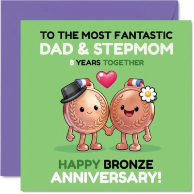 Brings a playful touch to their special day with cheerful medal characters holding hands and cheeky grins. Anniversary card for Stepmum & Dad with a light-hearted design style Features a fun illustrated motif of two friendly medals surrounded by hearts-perfect for celebrating togetherness. Recyclable and printed in UK for a considerate choice Printed on gloss single sided board with an uncoated inside. No smudging when writing inside. Printed on 360 micron stock for a confident, premium feel Inside message: Stepmum & Dad. Supplied with a matching envelope for a neat finish. The 145mm Square format is convenient to display or post Proudly made in the UK using FSC-certified; recyclable and designed to make them feel extra special. Printed in the UK. A thoughtful choice that helps you send smiles and warm wishes