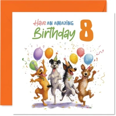Playful 8th Birthday Card Bursting with Cheer Dogs, Colourful Balloons and Confetti Perfect for a Bright Celebration 145mm Square, Envelope Included
