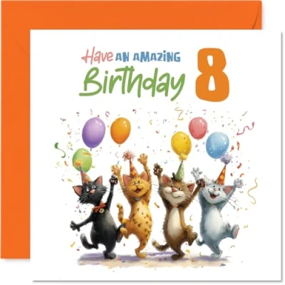 Playful 8th Birthday Card Bursting with Fun Cats, Balloons and Confetti A Colourful Way to Celebrate Turning Eight 145mm Square, Envelope Included