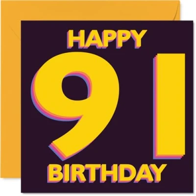 Bursts with celebratory spirit, thanks to its striking yellow 'HAPPY 91 BIRTHDAY' message shining out on a deep purple backdrop. Birthday card with a light-hearted design style Features a simple yet eye-catching numbers motif, making it ideal for anyone who loves a splash of colour with their birthday wishes. Recyclable; printed in UK for a considerate choice Printed on glossy board with an uncoated inside, so you can pen your personal message with ease. No smudging when writing inside. Printed on 360 micron stock for a confident, premium feel Blank inside to let your own words take centre stage; comes complete with an envelope for easy gifting. The 145mm Square format is convenient to display or post Proudly made in the UK using FSC-certified, recyclable -quality you can feel good about sending. Ideal for a mum or dad celebrating a milestone birthday
