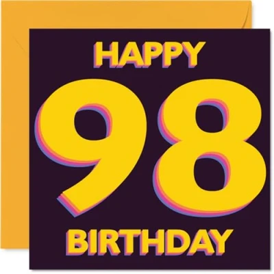 Bursting with personality, this card's lively yellow '98' leaps out to mark the special day. sure to raise a smile for anyone turning ninety-eight Features a striking number motif in bold yellow and purple, set against a dark backdrop for a fun and eye-catching look. Recyclable; printed in UK for a considerate choice Printed on gloss single sided board with an uncoated inside for easy writing - No smudging when writing inside. Made using FSC certified board and fully recyclable Blank inside, giving you loads of space for your personal message. Includes a matching envelope, so it's ready to send. The 145mm Square format is convenient to display or post Designed and printed in the UK, this card brings quality and cheer to any milestone celebration - ideal for a friend. grandparent or colleague