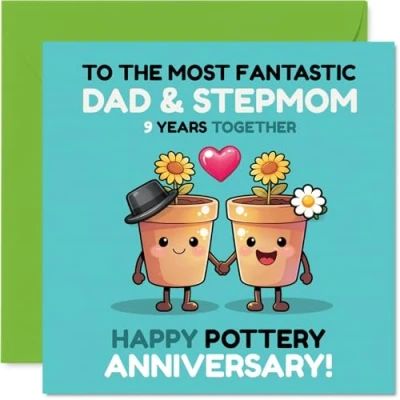 Playful and light-hearted, this card features cheery flower pots joining hands, guaranteed to spread smiles on a pottery anniversary. Anniversary card for Stepmum & Dad with a light-hearted design style The cartoon motif pops with fun blues, greens, yellows and pinks, bringing a whimsical feel to your celebration. Recyclable and printed in UK for a considerate choice Printed on gloss single sided board with an uncoated inside, so there's no smudging when writing inside and your message stays crisp. Printed on 360 micron stock for a confident, premium feel Inside message: Stepmum & Dad. Envelope included for a perfectly presented gesture. The 145mm Square format is convenient to display or post Designed and printed in the UK using FSC-certified and recyclable materials - send a card you feel good about. A thoughtful choice that helps you send smiles and warm wishes