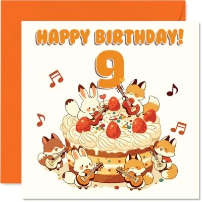 Playful 9th Birthday Card Bursting with Cheer Adorable Animals Strumming Guitars Around a Cake 145mm Square, Envelope Included