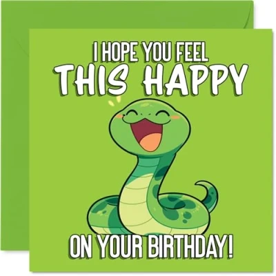 Spreads instant joy with a beaming cartoon snake and playful message to make anyone smile on their birthday. Birthday card with a light-hearted design style Features a bold animal motif with a vibrant green backdrop, setting a fun and lively tone for the celebration. Recyclable and printed in UK for a considerate choice Printed on gloss single sided board with uncoated inside, so there's no smudging when writing inside your message. Printed on 360 micron stock for a confident, premium feel Blank inside, giving you space to pen your own heartfelt wishes; comes complete with an envelope for easy gifting. The 145mm Square format is convenient to display or post Proudly printed in the UK using FSC-certified, recyclable - crafted for both quality and eco-consciousness