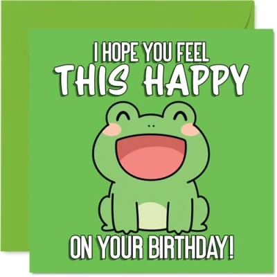 Brighten someone's special day with a cheerful frog character beaming with happiness, instantly lifting spirits and setting a playful tone. Birthday card with a light-hearted design style Features a quirky green frog, radiating joy - the perfect design for anyone who loves a bit of fun and whimsy on their birthday. Recyclable and printed in UK for a considerate choice Printed on quality gloss board with an uncoated inside for easy writing. No smudging when writing inside, so your message stays crisp. Printed on 360 micron stock for a confident, premium feel Blank inside, giving you plenty of space for your own personal birthday wishes. Includes an envelope for easy gifting. The 145mm Square format is convenient to display or post Designed and printed in the UK using FSC-certified, recyclable materials - a card you can feel good about sending