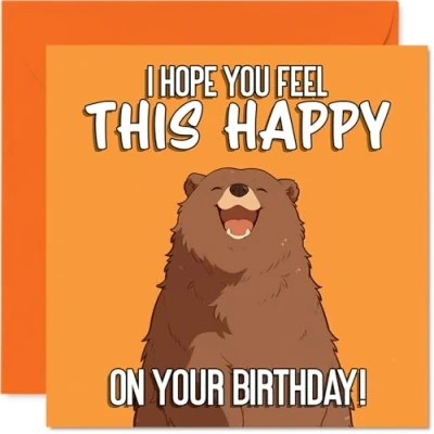 Radiates feel-good fun with a beaming bear and upbeat birthday message, sure to spread smiles all round. Birthday card with a light-hearted design style Features a cheerful orange bear motif, adding a pop of colour and character that stands out on any mantelpiece. Recyclable and printed in UK for a considerate choice Crafted on glossy single-sided board with an uncoated inside - no smudging when writing inside and fully recyclable. Printed on 360 micron stock for a confident, premium feel Blank inside, so you can pen your own personal wishes. Includes envelope for easy gifting. The 145mm Square format is convenient to display or post Made in the UK using FSC-certified, so you can send your birthday wishes with confidence and care