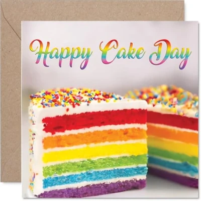 Packed with playful energy, this card's bold rainbow cake and cheerful 'Happy Cake Day' message guarantee smiles all round. Birthday card with a light-hearted design style Features a showstopper multi-layered cake covered in rainbow sprinkles - a design that brings pure celebration to life. Recyclable and printed in UK for a considerate choice Printed on gloss single sided board with an uncoated inside for easy writing. No smudging when writing inside. Printed on 360 micron stock for a confident, premium feel Blank inside, so you can personalise your message however you like. Includes a matching envelope for a polished finish. The 145mm Square format is convenient to display or post Designed and printed in the UK using FSC-certified - a quality choice you can feel good about sending. Ideal for a mum or dad celebrating a milestone birthday