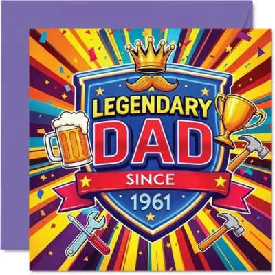 Festive and playful, this card celebrates a truly legendary dad with a crown and trophy front and centre - guaranteed to bring a grin. Birthday card with a light-hearted design style Vibrant blues, yellows and reds set off the bold 'LEGENDARY DAD SINCE 1961' motif, making it a real eye-catcher for any celebration. Recyclable and printed in UK for a considerate choice Printed on quality gloss single sided board with an uncoated inside, so there's no smudging when writing inside. Printed on 360 micron stock for a confident, premium feel Blank inside for your own message and comes complete with a matching envelope for easy gifting. The 145mm Square format is convenient to display or post Designed and printed in the UK, fully recyclable and made using FSC certified - send your wishes with confidence. Ideal for a mum or dad celebrating a milestone birthday