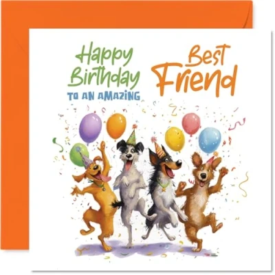 Brimming with birthday cheer, this card's lively dog squad and bright balloons bring instant smiles for your favourite mate. Birthday card for Best Friend with a light-hearted design style Features four adorable dogs donning party hats, surrounded by confetti and a riot of colour for a truly celebratory vibe. Recyclable and printed in UK for a considerate choice Printed on quality gloss single sided board with an uncoated inside for easy writing. No smudging when writing inside. Printed on 360 micron stock for a confident, premium feel Blank inside, giving you space to pen your own personal birthday wishes. Includes a matching envelope for easy gifting. The 145mm Square format is convenient to display or post Designed and printed in the UK using FSC-certified -eco-friendly, recyclable and made to make their day extra special. A thoughtful choice that helps you send smiles and warm wishes