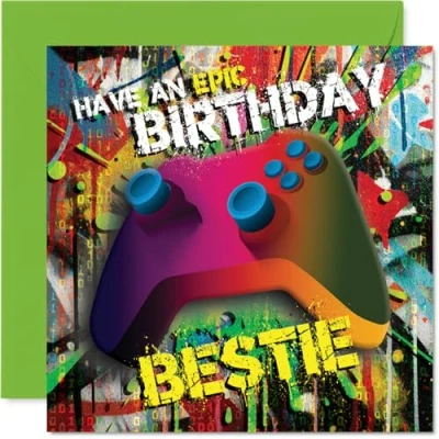 Bursting with playful energy, this card features a bold gaming controller that's sure to bring a grin to your best mate's face. Birthday card for Bestie with a light-hearted design style Striking multicolour and green design pops with a dynamic, abstract background, making it stand out from the crowd. Recyclable and printed in UK for a considerate choice Printed on gloss single sided board with an uncoated inside - no smudging when writing inside - and made with FSC board for peace of mind. Printed on 360 micron stock for a confident, premium feel Blank inside so you can pen your own epic birthday message; comes with an envelope for easy gifting. The 145mm Square format is convenient to display or post Designed and printed in the UK, using recyclable materials for a card you can feel good about sending. A thoughtful choice that helps you send smiles and warm wishes