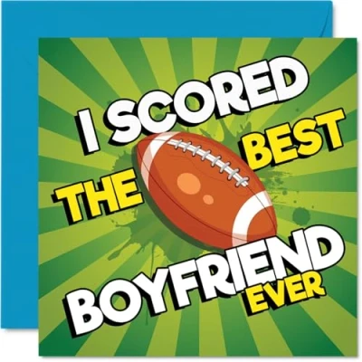 Brings a smile with its cheeky football pun, featuring the lively phrase 'I SCORED THE BEST BOYFRIEND EVER' in big, bold lettering. Birthday card for Boyfriend with a light-hearted design style Eye-catching design shows a football on a grassy pitch, bright colours and energetic style make it stand out on any mantelpiece. Recyclable and printed in UK for a considerate choice Printed on quality gloss board with an uncoated inside-no smudging when writing inside, so your personal message stays crisp. Printed on 360 micron stock for a confident, premium feel Blank inside, giving you loads of space to write your own birthday wishes; comes complete with an envelope for easy gifting. The 145mm Square format is convenient to display or post Designed and printed in the UK using recyclable FSC -feel good about celebrating while making him feel special. A thoughtful choice that helps you send smiles and warm wishes