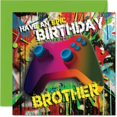 Bursts with playful energy thanks to its bold 'HAVE AN EPIC BIRTHDAY BROTHER' message and colourful gaming controller front and centre. Birthday card for Brother with a light-hearted design style Features a graffiti-inspired background in lively greens and multicolour, sure to catch the eye of any gaming fan. Recyclable and printed in UK for a considerate choice Printed in the UK on quality gloss board with an uncoated inside. No smudging when writing inside. Printed on 360 micron stock for a confident, premium feel Blank inside, giving you the space to add your own personal touch. Comes with an envelope for easy gifting. The 145mm Square format is convenient to display or post Designed to bring a smile and crafted from FSC. Fully recyclable, so it's cheerful for the planet too. Printed in the UK. A thoughtful choice that helps you send smiles and warm wishes