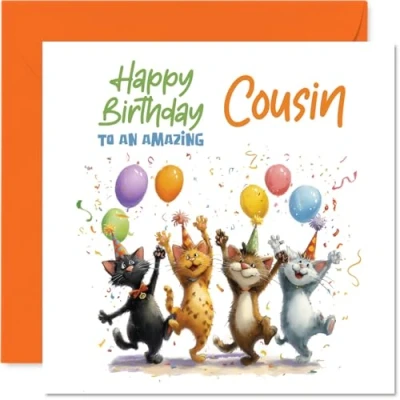 Playful Birthday Card for Cousin Bursting with Cheer Four Festive Cats and Colourful Balloons Guaranteed to Make Your Smile 145mm Square, Envelope Included