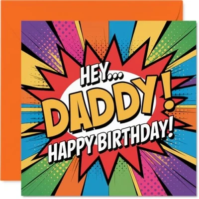 Full of lively charm, this card uses a comic-style speech bubble and punchy colours to bring a huge smile to Daddy's special day. Birthday card for Daddy with a light-hearted design style Features multicolour pop art graphics and a bold orange backdrop, making it a real eye-catcher amongst the usual birthday cards. Recyclable and printed in UK for a considerate choice Gloss single sided board with an uncoated inside. No smudging when writing inside, so your personal message stays crisp and clear. Printed on 360 micron stock for a confident, premium feel Blank inside for your own message, so you can add that personal touch. Includes a matching envelope for easy gifting. The 145mm Square format is convenient to display or post Proudly printed in the UK, recyclable, and made using FSC-certified for eco-friendly peace of mind. A thoughtful choice that helps you send smiles and warm wishes