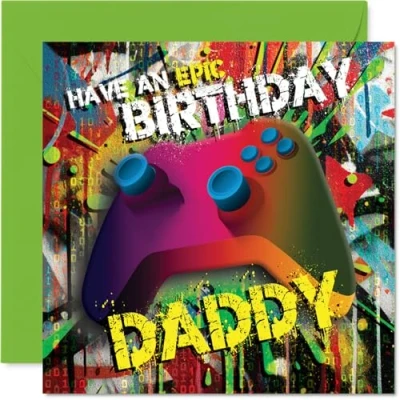 Bursts with playful birthday energy, featuring a bold gaming controller ready for a high-score celebration. Birthday card for Daddy with a light-hearted design style Striking multicolour design pops against a lively backdrop, perfect for a dad who enjoys a bit of gaming fun. Recyclable and printed in UK for a considerate choice Printed on quality gloss board with an uncoated inside for easy personal messages. No smudging when writing inside. Printed on 360 micron stock for a confident, premium feel Blank inside so you can craft your own special birthday wish. Envelope included for easy gifting. The 145mm Square format is convenient to display or post Designed and printed in the UK with recyclable materials and FSC-certified, so you can celebrate with confidence. A thoughtful choice that helps you send smiles and warm wishes