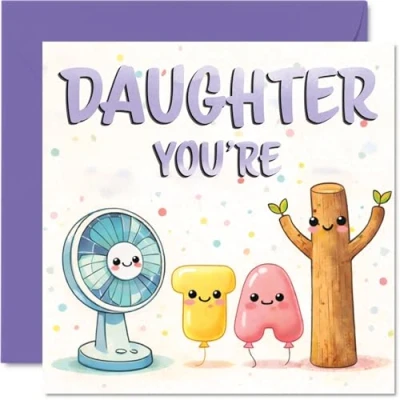 Packed with cheerful energy, this card features a charming cartoon fan and colourful shapes to bring a playful smile to your daughter's birthday Whimsical pastel design with adorable characters creates a fun, modern twist-sure to stand out amongst the usual cards. Recyclable and printed in UK for a considerate choice Printed in the UK on recyclable FSC board, with a gloss finish outside and an uncoated inside. No smudging when writing inside. Printed on 360 micron stock for a confident, premium feel Blank inside, giving you all the space for a heartfelt or cheeky birthday message. Comes with its own envelope for easy gifting. The 145mm Square format is convenient to display or post Designed with care for your peace of mind-quality materials, bright print and that extra bit of joy for her special day. Printed in the UK. A thoughtful choice that helps you send smiles and warm wishes