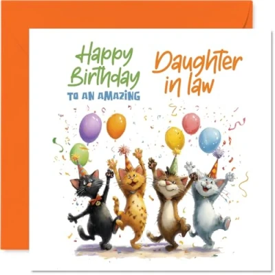 Playful Birthday Card for Daughter in Law Cats Party Mode Four Cheeky Felines with Balloons and Confetti 145mm Square, Envelope Included