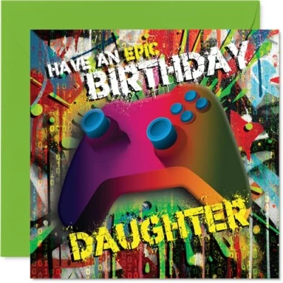 Packed with energy and fun, this card's bold gaming controller and splashy colours capture the excitement of her special day. Birthday card for Daughter with a light-hearted design style Features a lively, multicolour design with a striking games console motif - ideal for daughters who love all things gaming. Recyclable and printed in UK for a considerate choice Printed on quality gloss single sided board with an uncoated inside for mess-free messages. No smudging when writing inside. Printed on 360 micron stock for a confident, premium feel Blank inside for your personal touch, plus comes with an envelope so it's ready to gift straight away. The 145mm Square format is convenient to display or post Expertly crafted in the UK using recyclable materials and FSC certified - a card you can feel good about giving. Printed in the UK. A thoughtful choice that helps you send smiles and warm wishes