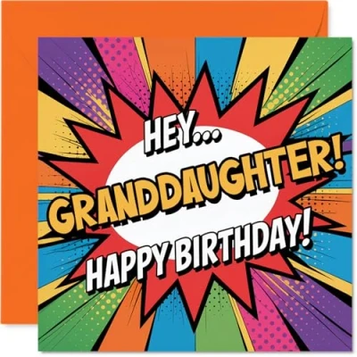 Radiates joyful birthday vibes with its vibrant comic-style artwork and big, bold 'HEY.. GRANDDAUGHTER!' greeting that feels genuinely celebratory Features a punchy multicolour motif and playful text, making it stand out from the usual cards - a fun twist she'll love showing off. Recyclable and printed in UK for a considerate choice Printed on gloss single sided board with an uncoated inside for a smooth writing experience. No smudging when writing inside. Printed on 360 micron stock for a confident, premium feel Blank inside, giving you the freedom to pen your own personal birthday message. Includes a matching envelope for easy gifting. The 145mm Square format is convenient to display or post Crafted in the UK using FSC-certified and fully recyclable materials, so you can celebrate with a clear conscience. Printed in the UK. A thoughtful choice that helps you send smiles and warm wishes