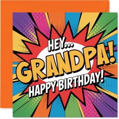 Playful Birthday Card for Grandpa Bursting with Comic Energy Vibrant Pop Art Design Bold 'hey... Grandpa!' 145mm Square, Envelope Included
